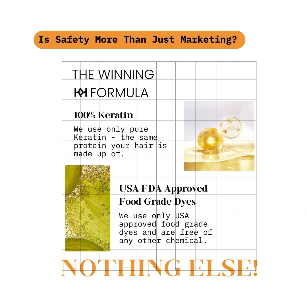 Kerrato stands out in the market for its commitment to safety, quality, and results. Our hair fibres are made from just two ingredients: 100% pure Keratin and FDA-approved food-grade dyes. Unlike many other brands that use cotton fibres requiring chemical additives, Kerrato is free from such chemicals, providing you a safer alternative. -