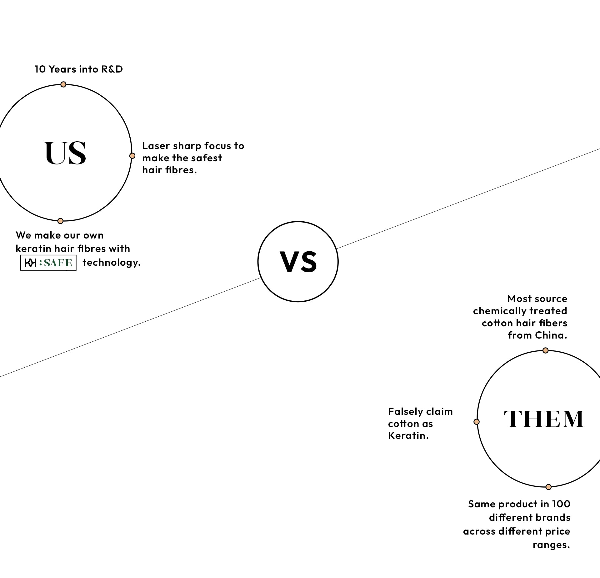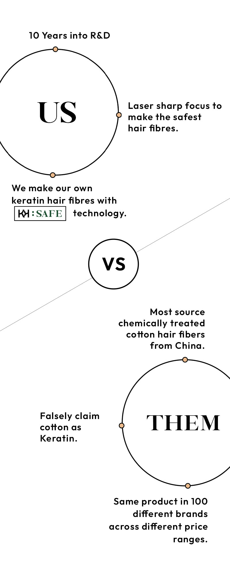 Cotton hair fibres might seem like a good idea at first, but they absorb sweat and can clump together, making it obvious that you're using a product. Plus, lots of unapproved chemicals go into making them. Kerrato, on the other hand, uses keratin to give a seamless, natural look without these nasty chemicals. -